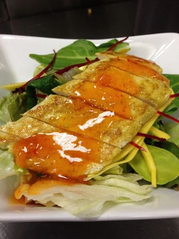 Chicken marinaded with curry sauce. gilled, top with green salad.