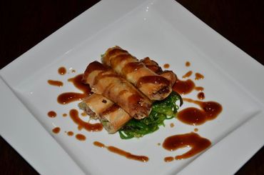 Shredded duck, celery, mushroom wrapped with rice paper, with plum sauce